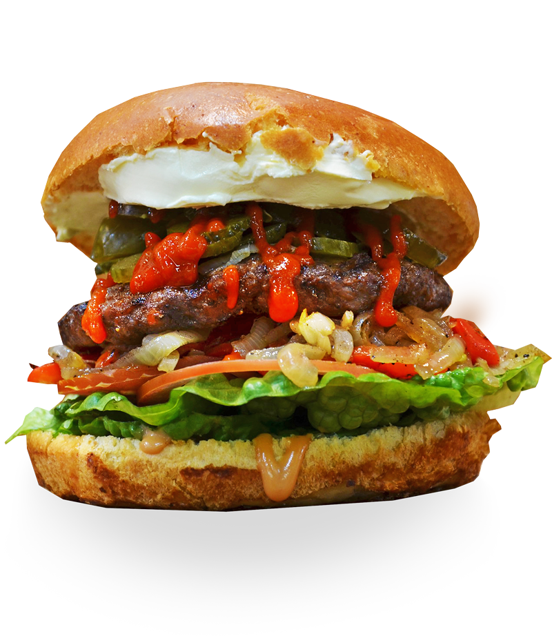 Wagyu beef Pattie with lettuce, tomato, caramelised onion, rosted peppers, pickels, jalapenos, hot chilli sauce and hot chilli mayo.